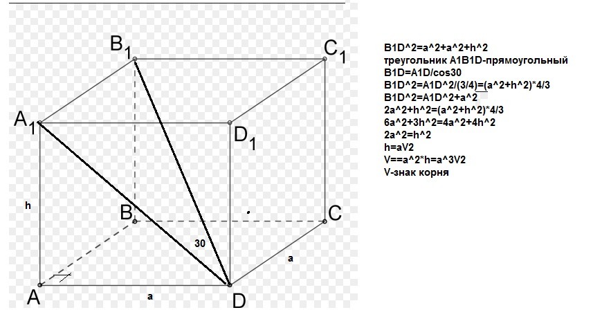 3. Основанием прямоугольного параллелепипеда служит квадрат со стороной а. Диагональ параллелепипеда составляет с боковой гранью угол 30º. Найдите его объем.
