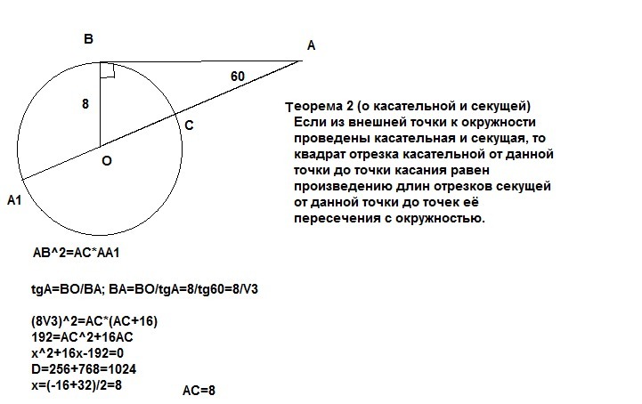 1.Дана сфера и еѐ касательная плоскость. В плоскости находится точка А, через неѐ и центр сферы проведена прямая. Эта прямая образует с касательной плоскостью угол 60º и пересекает сферу в точке С. Радиус данной сферы — 8. Найдите длину отрезка АС. (ответ округлите до сотых).