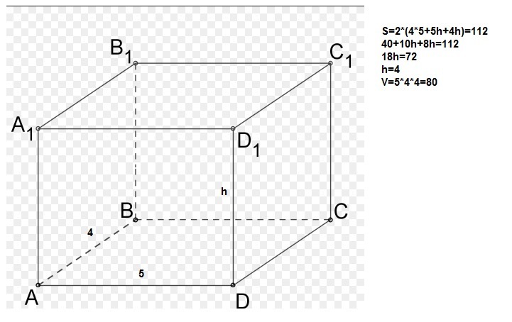 4. Два ребра прямоугольного параллелепипеда, выходящие из одной вершины, равны 4 и 5. Площадь поверхности этого параллелепипеда равна 112. Найдите объем параллелепипеда.