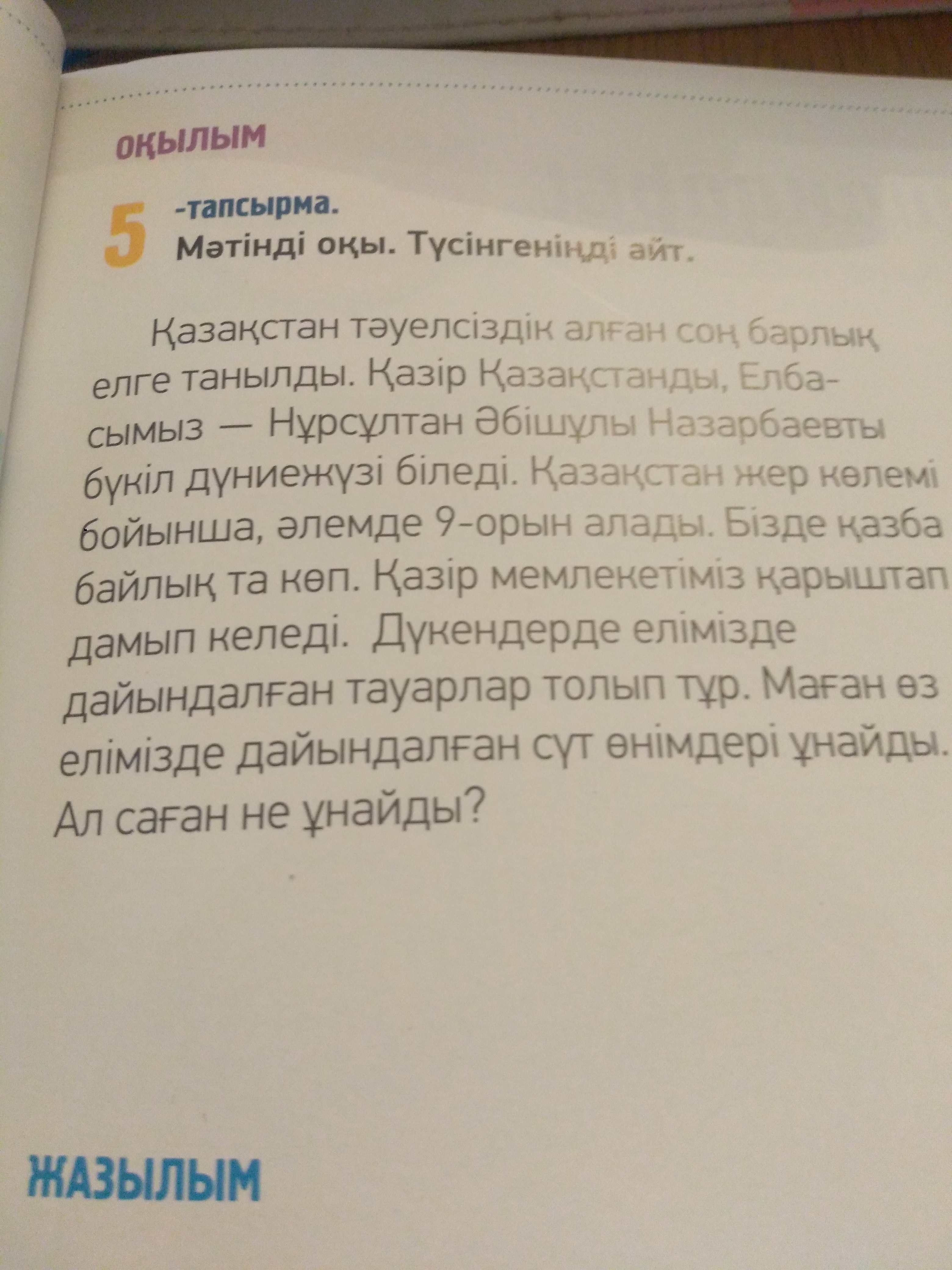Казахстан обрел независимость после того, как Казахстан обрёл независимость. Сегодня весь мир знает президента Казахстана Нурсултан Назарбаев. Казахстан является лидером нашей нации -Нурсултана Назарбаева Казахстан занимает 9-е место в мире. У нас много окаменелостей. В наше время наше государстве динамично развевается. Магазины полны гор старане. Мне нравиться молочные продукты в нашей стране. А тебе что нравиться