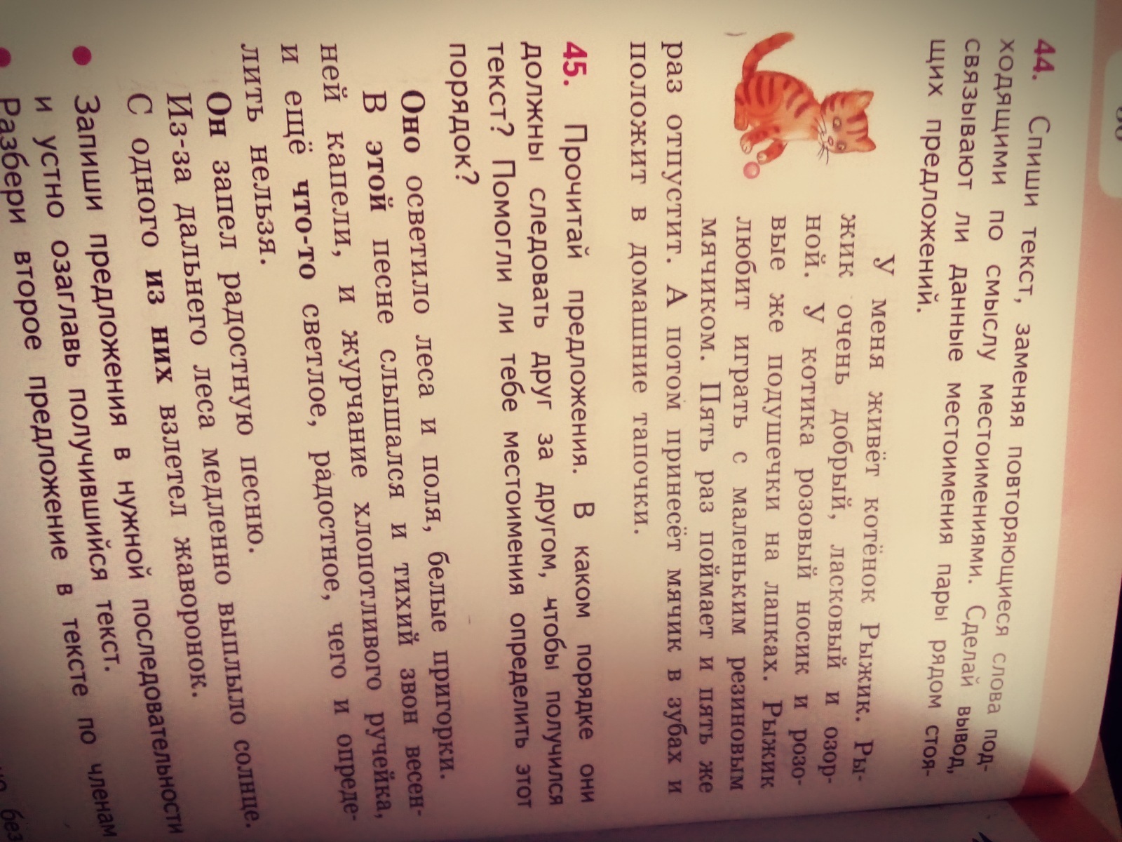 У меня живет котёнок Рыжик. Он очень добрый, ласковый и озорной. У котика розовый носик и подушечки на лапках. Рыжик любит играть с маленьким резиновым мячиком. Пять раз поймает он и отпустит. А потом принесет мячик в зубах и положит в домашие тапочки.