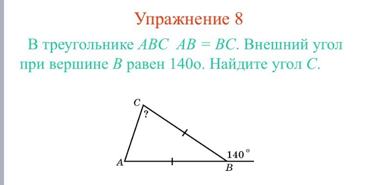 В нашем случае - внешний угол =140°, два несмежных угла -∠С и ∠А