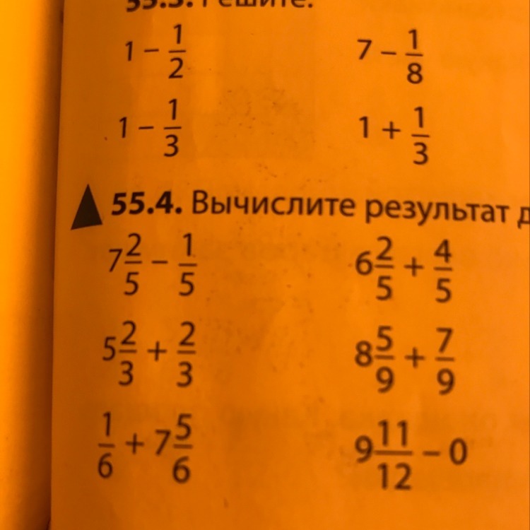 1. 7 2/5-1/5=7 1/5 2. 5 2/3+2/3=6 1/3 3. 1/6+7 5/6=8 4. 6 2/5+4/5=7 1/5 5. 8 5/9+7/9=9 3/9 6. 9 11/12 в шестом сразу ответ