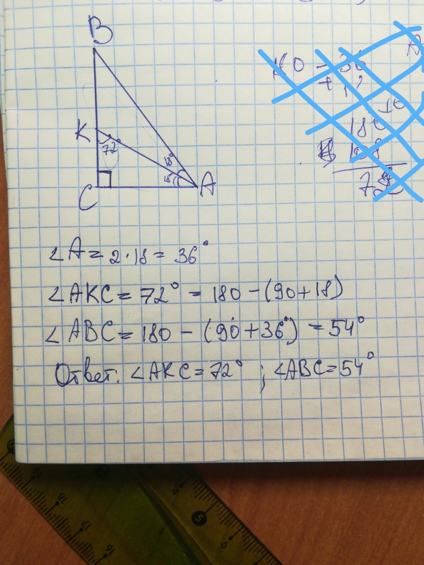 в треугольнике авс известно, что угол с=90 градусов, ак-биссектриса, угол вак=18 градусов. найдите углы акс и авс