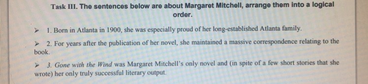 Task III. The sentences below are about Margaret Mitchell, arrange them Into a logical order.