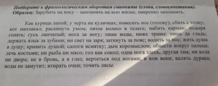 Как курица лапой - неаккуратно; у черта на куличиках - очень далеко; повесить нос (голову) - грустить; сбить с толку - запутать; кот наплакал - очень мало; раскинуть умом - подумать; пятое колесо в телеге - быть лишним; набить карманы - получать много денег (часто нечестным путём); лодыря гонять - лениться; гусь лапчатый - ловкий человек; нога за ногу - очень медленно идти; тише воды, ниже травы - быть незаметным; тишь да гладь - полное спокойствие; держать язык за зубами - не говорить о чем-либо; ни свет, ни заря - рано очень; заткнуть за пояс - превзойти кого-то, быть лучшим; водить за нос - обманывать; жить душа в душу - жить в согласии и понимании; кривить душой - врать специально; сапоги всмятку - бред, ерунда; дым коромыслом - шум, беспорядок, суматоха; обвести вокруг пальца - обхитрить; лечь костьми - поклясться; ни рыба ни мясо - ничего особенного; гол как сокол - страшно беден; одна нога здесь, другая там - очень быстро; ни кола ни двора - не иметь никакого имущества; не в бровь, а глаз - метко, точно; вертеться под ногами - надоедать; в кои веки - наконец произойти; валять дурака - притворятся глупым; воды не замутит - быть тихим, мирным; втирать очки - мошенничать, дурачить; точить лясы - заниматься пустой болтовнёй.