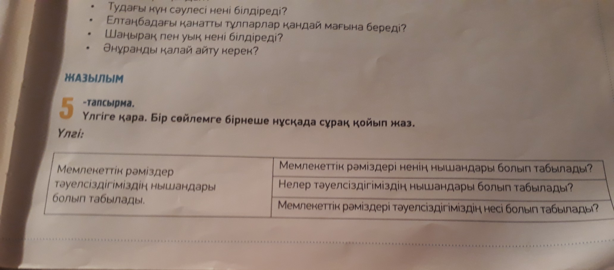 Үлгіге қара. Бір сөйлемге бірнеше нұскада сұрақ қойып жаз