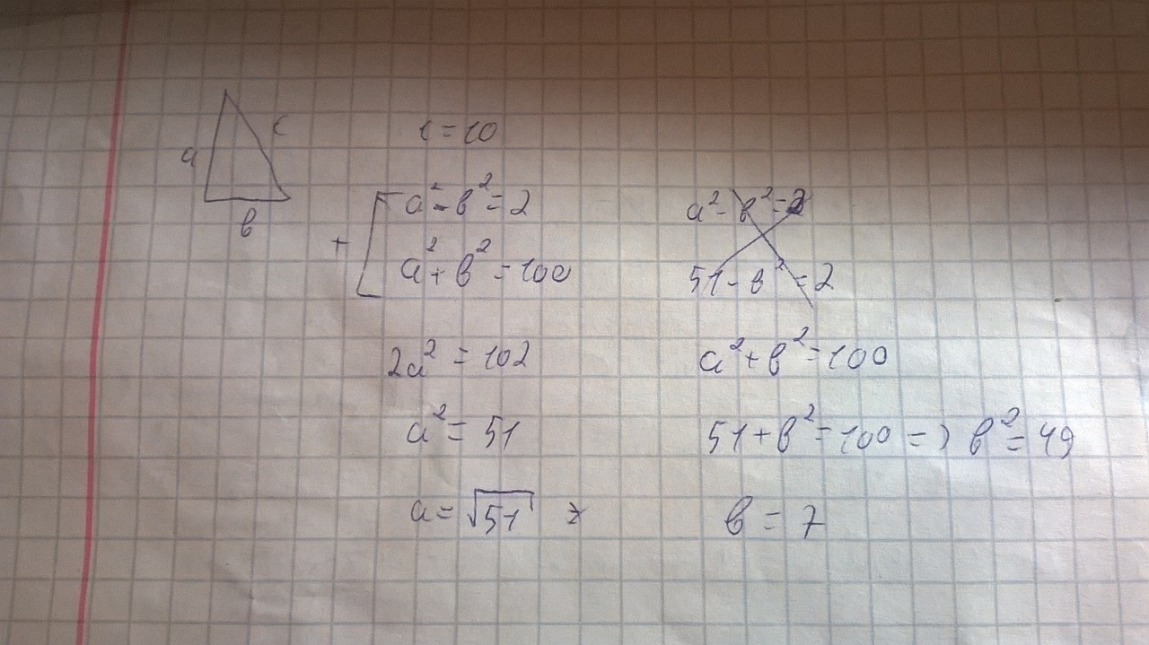 гипотенуза прямоугольного треугольника равна 10,а разность квадратов катетов равна 2. Найдите меньший катет