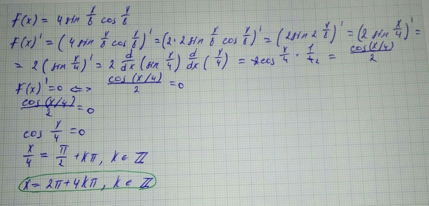 Решите уравнение f'(x)=0, если f(x)=4sin(x8)*cos(x8).