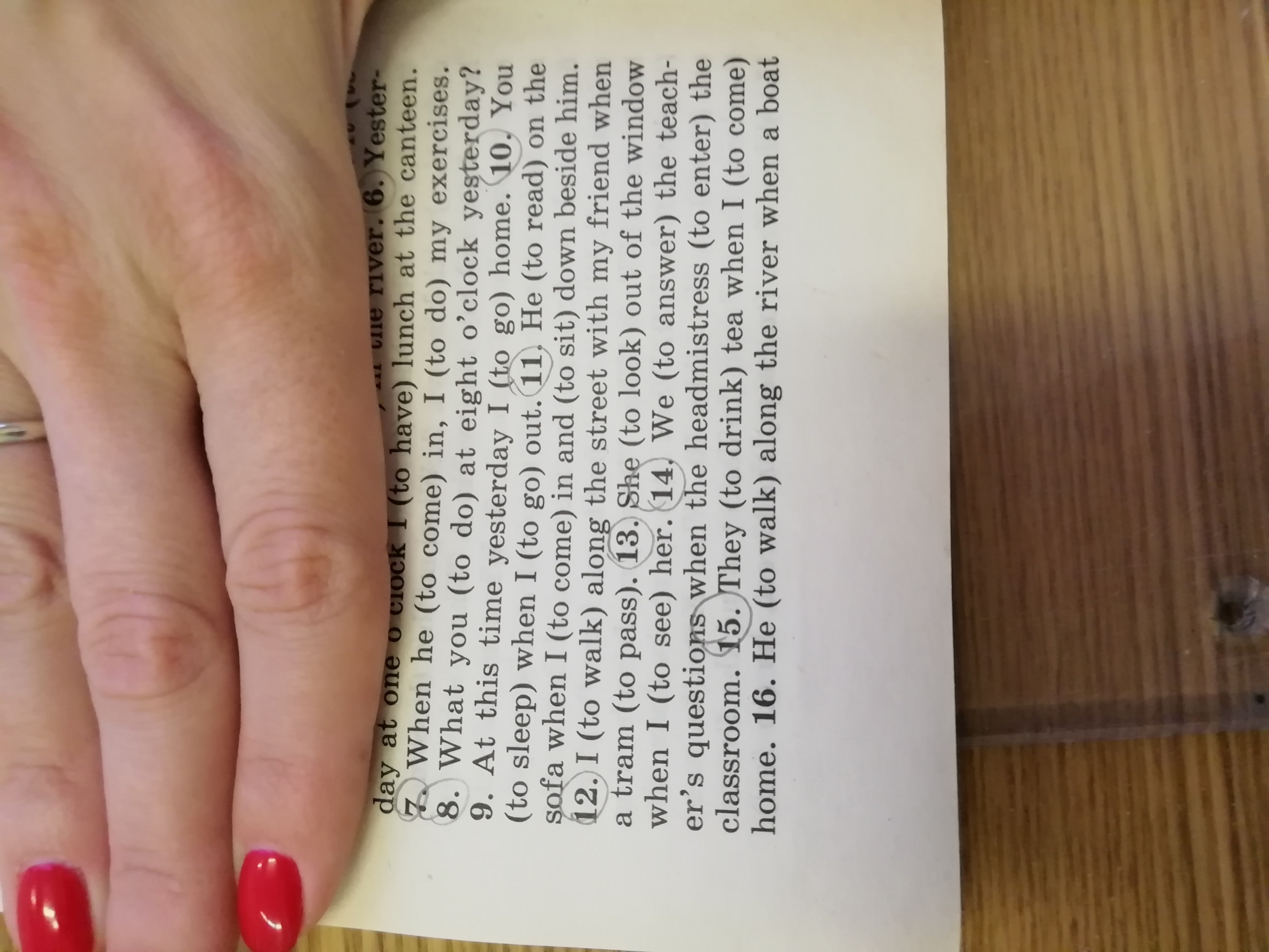 7 came in- was doing 8 were you doing 9 was going 10 were you sleeping - went 11 was reading - came-sat 12 was walking - passed 13 was looking - saw 14 were answering - entered 15 were drinking - came 16 was walking