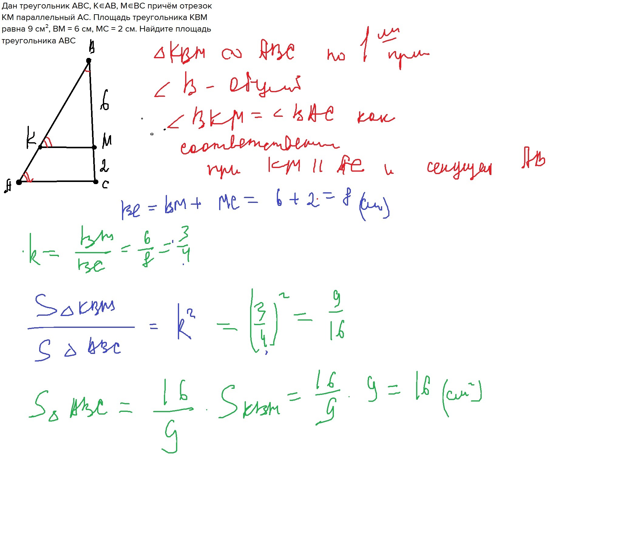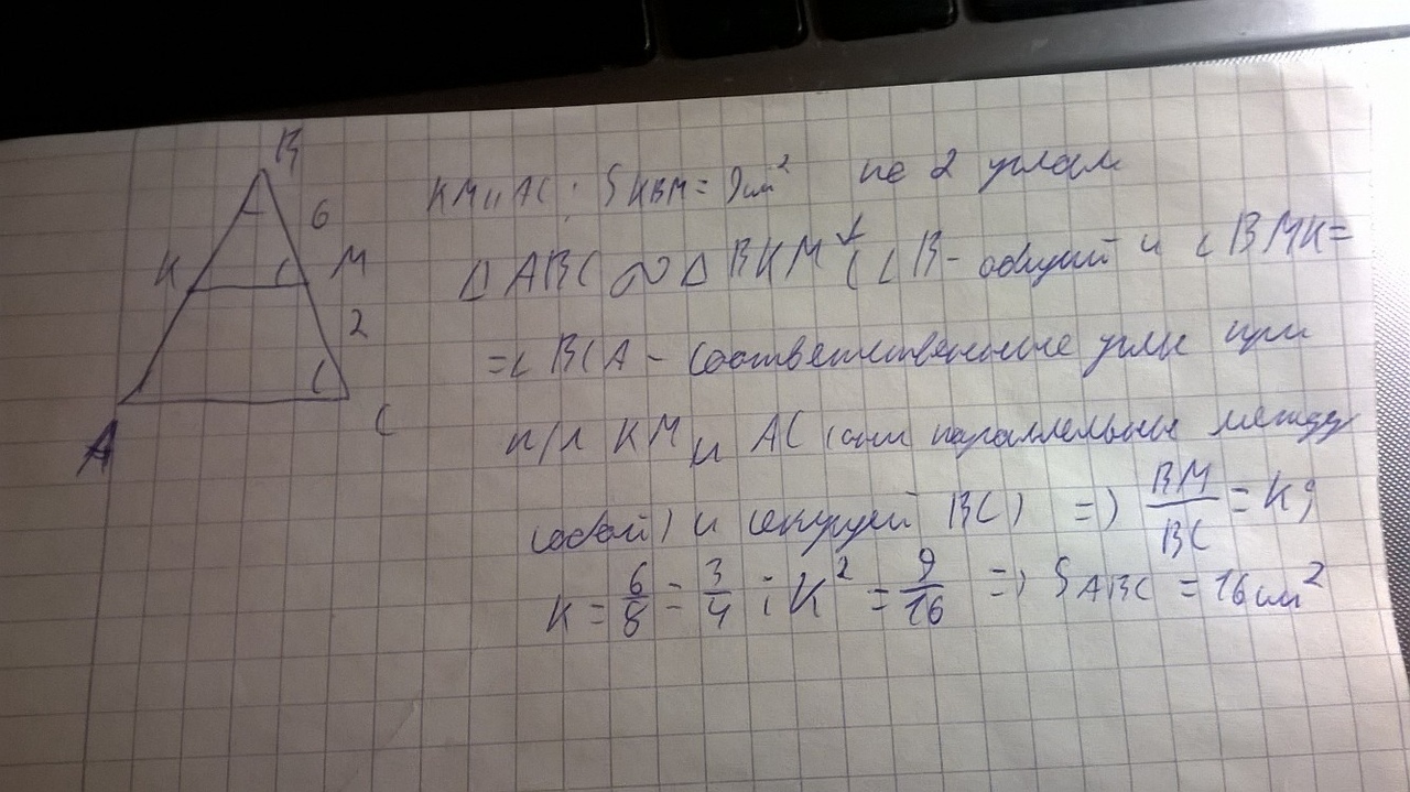 Помогите решить ответ должен быть развернутым Дан треугольник АВС, К∈АВ, М∈ВС причём отрезок КМ параллельный АС. Площадь треугольника КВМ равна 9 см², ВМ = 6 см, МС = 2 см. Найдите площадь треугольника АВС