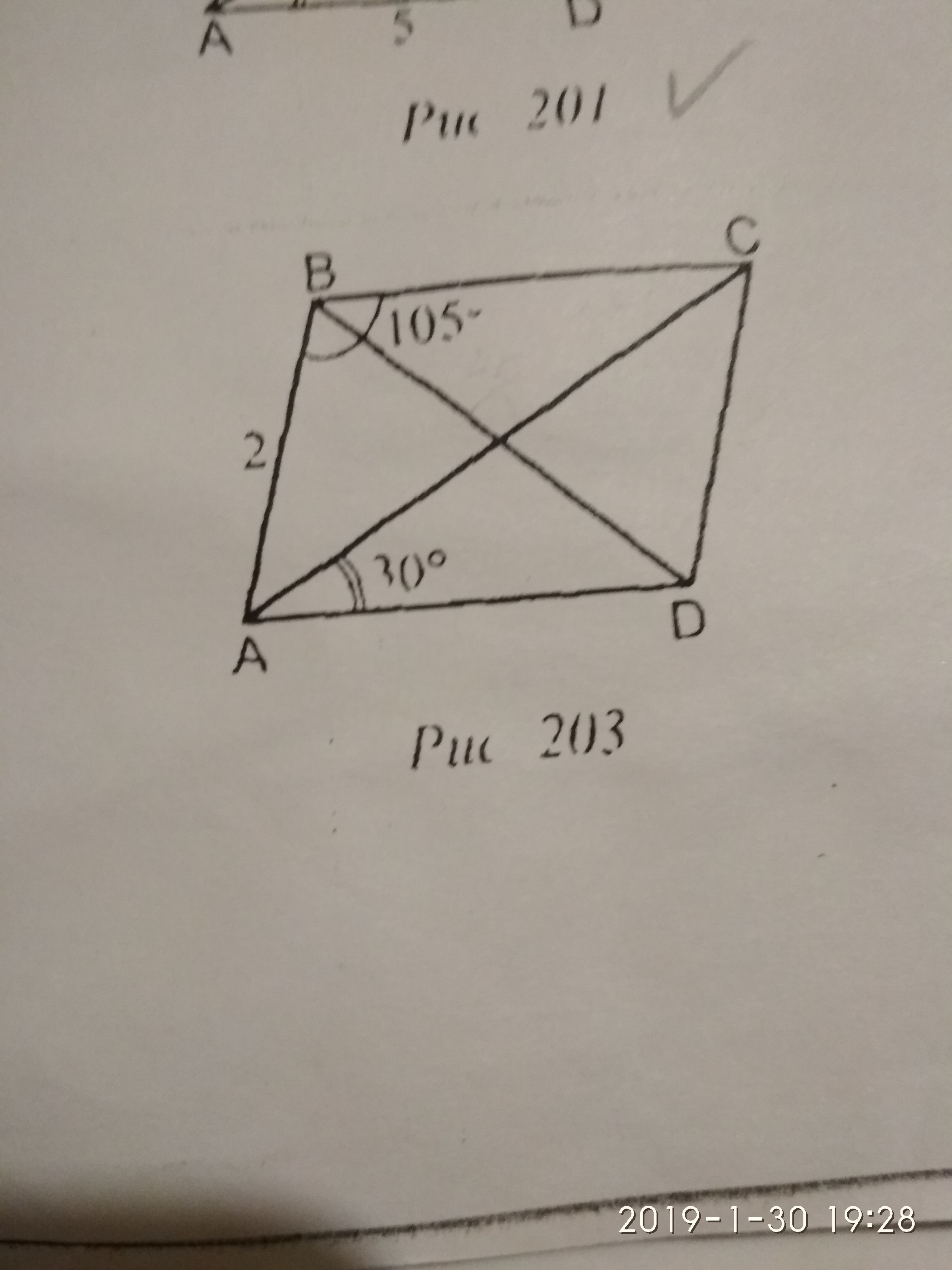 BCA=30 как накрестлежащий с CAD, BAC=180-105-30=45, по теореме о сумме углов треугольника для ABC, тогда по теореме синусов AB/sin(30)=BC/sin(45) => BC=AB*sin(45)/sin(30)=2*(sqrt(2)/2)/(1/2)=2*sqrt(2), где sqrt(x) - корень квадратный из х