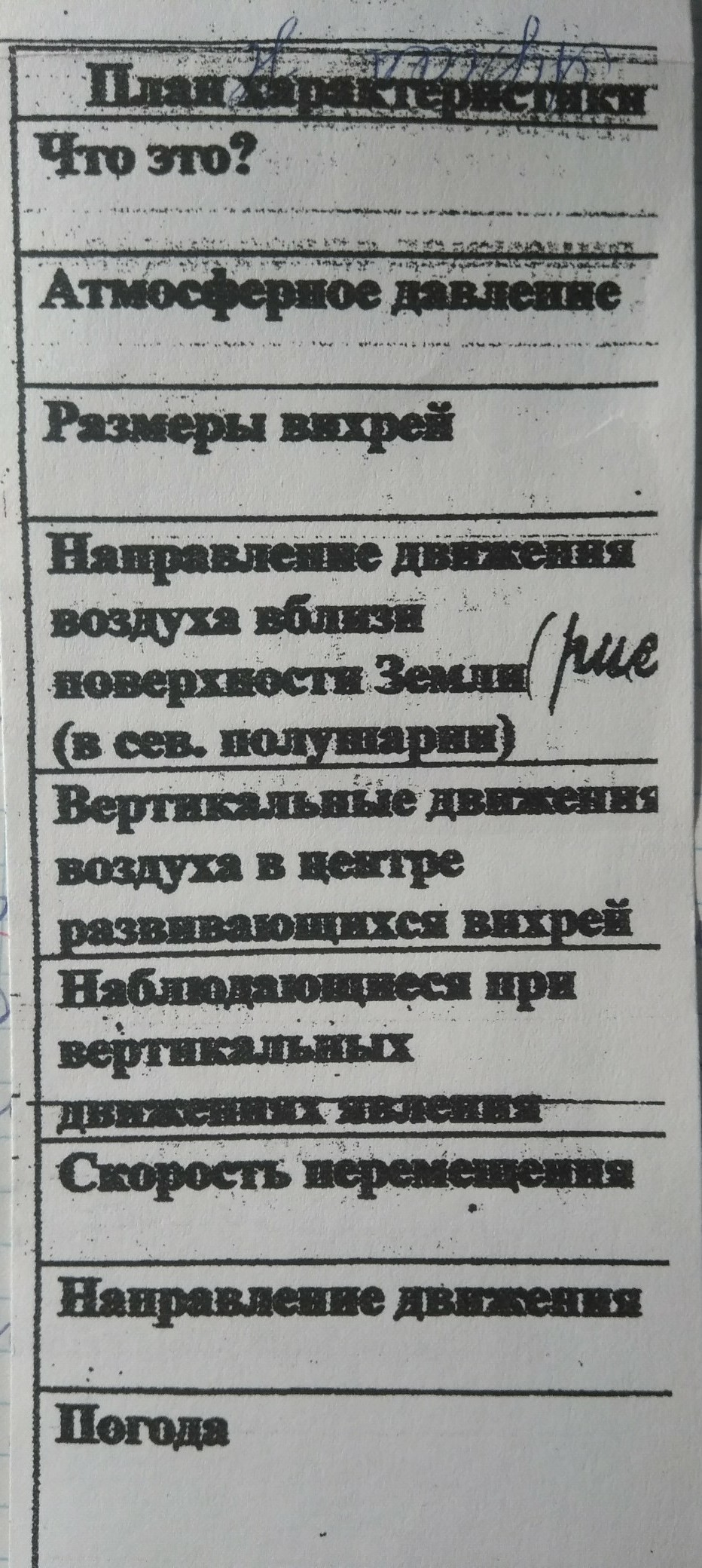 Нужно составить характеристику циклона/антициклона по пунктам. Ответ на каждый пункт отметить цифрой. Спасибо!