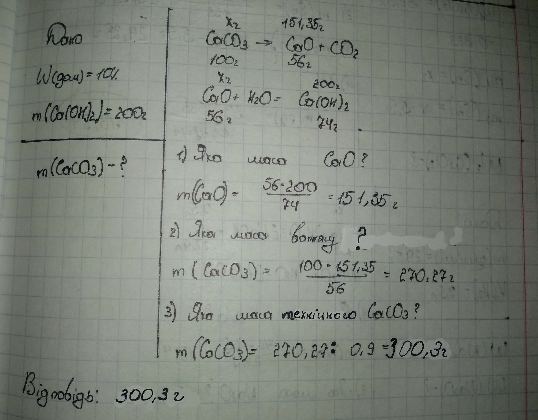 Обчислити масу вапняку що містить 10 % домішок, необхідну для добування кальцій гідроксиду масою 200г