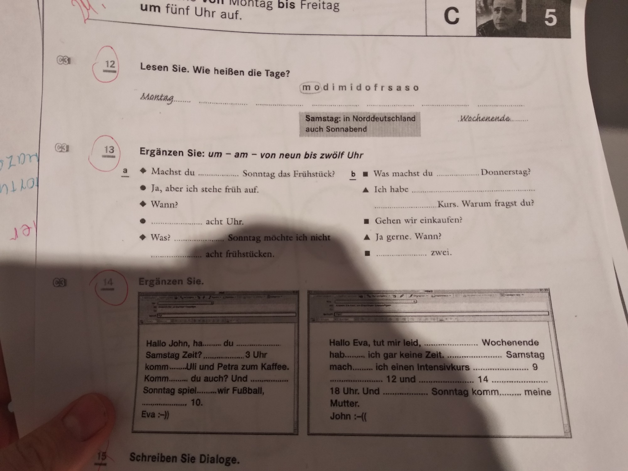 Am Wochenende, habe ich, Am Samstag, mache ich, von 9 bis 12 und von 14 bis 18 Uhr.