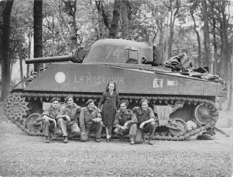 Французский "Шерман" М4А3(105), штурмовой танк со 105-мм пушкой-гаубицей, из состава 501-го танкового полка (501e regiment de chars de combat, одна из самых элитных частей французской армии) 2-й танковой дивизии (легендарная 2e division blindee генерала Леклерка), осень 1944 года/точная дата не известна/. Экипаж танка сфотографирован со своей "крестной матерью" (marraine), символической опекуншей. Личное имя машины "La Moskowa" дало основание для версии, что французы таким образом почтили своих советских союзников - но это не правда. Танк назван в честь Бородинского сражения. Достоверно известно, что этот "Шерман" участвовал во взятии Парижа.
