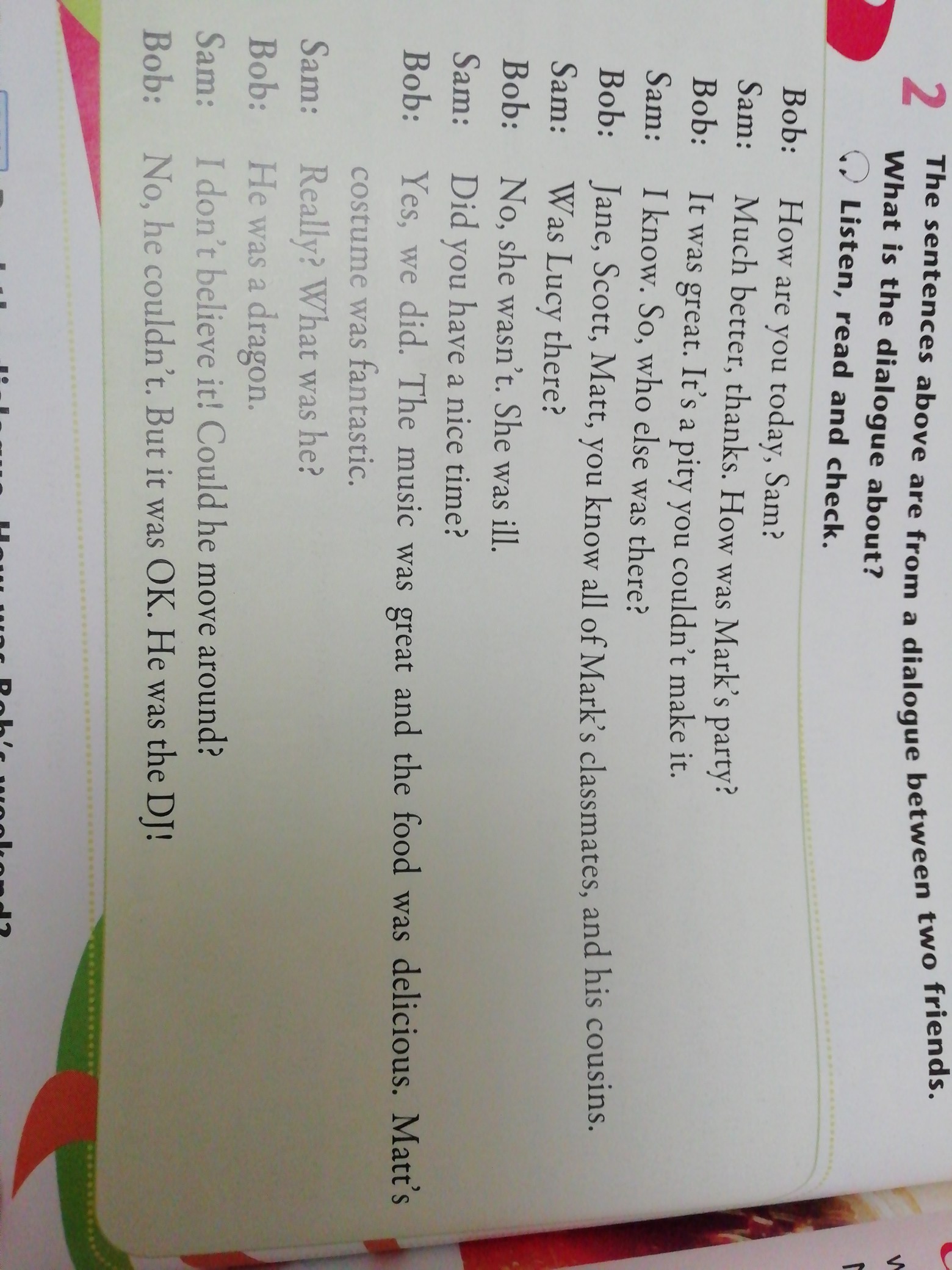 Bob decided to have a party. She had a lot of guests. Sam came too. There was a lot of delicious food on the table. But the most important place occupied a huge cake.