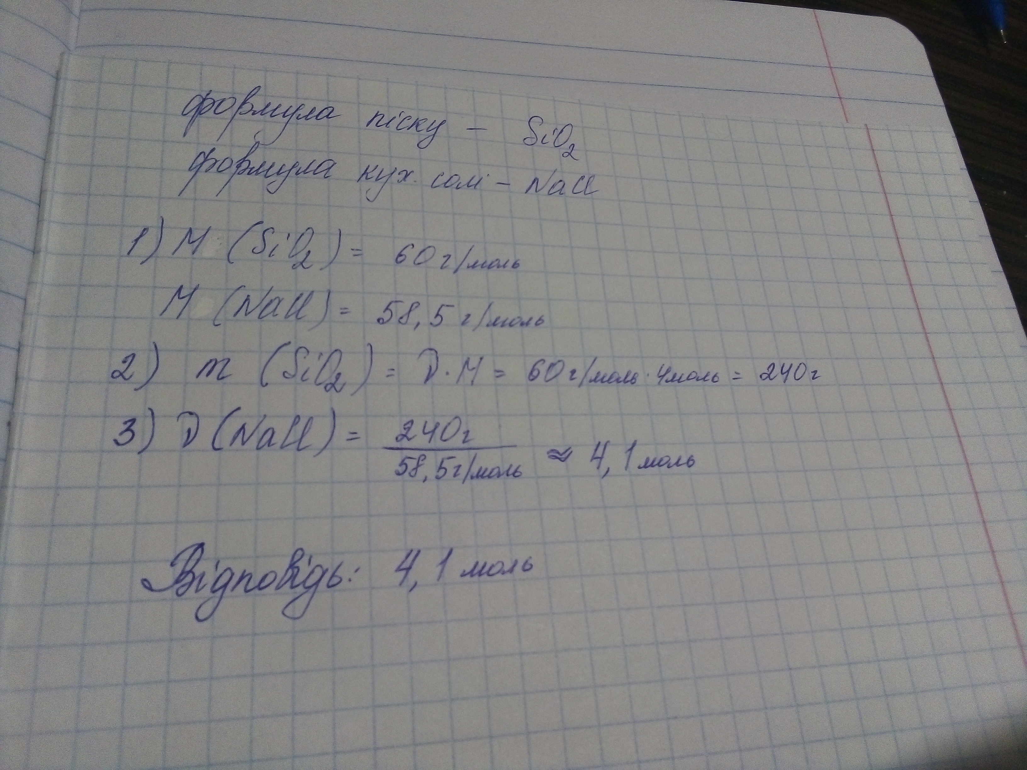 На одну шальку терезів поклали пісок кількістю речовини 4 моль. Яку масу кухонної солі потрібно покласти на другу шальку терезів, щоб їх урівноважити?