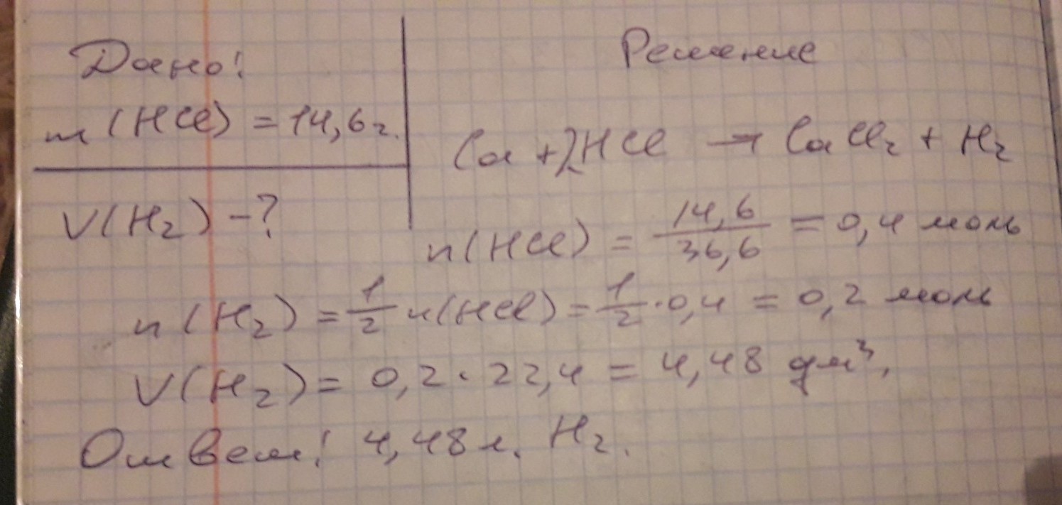 Вычисли объем водорода который образуется при взаимодействии кальция с соляной кислотой HCl массой 14.6г