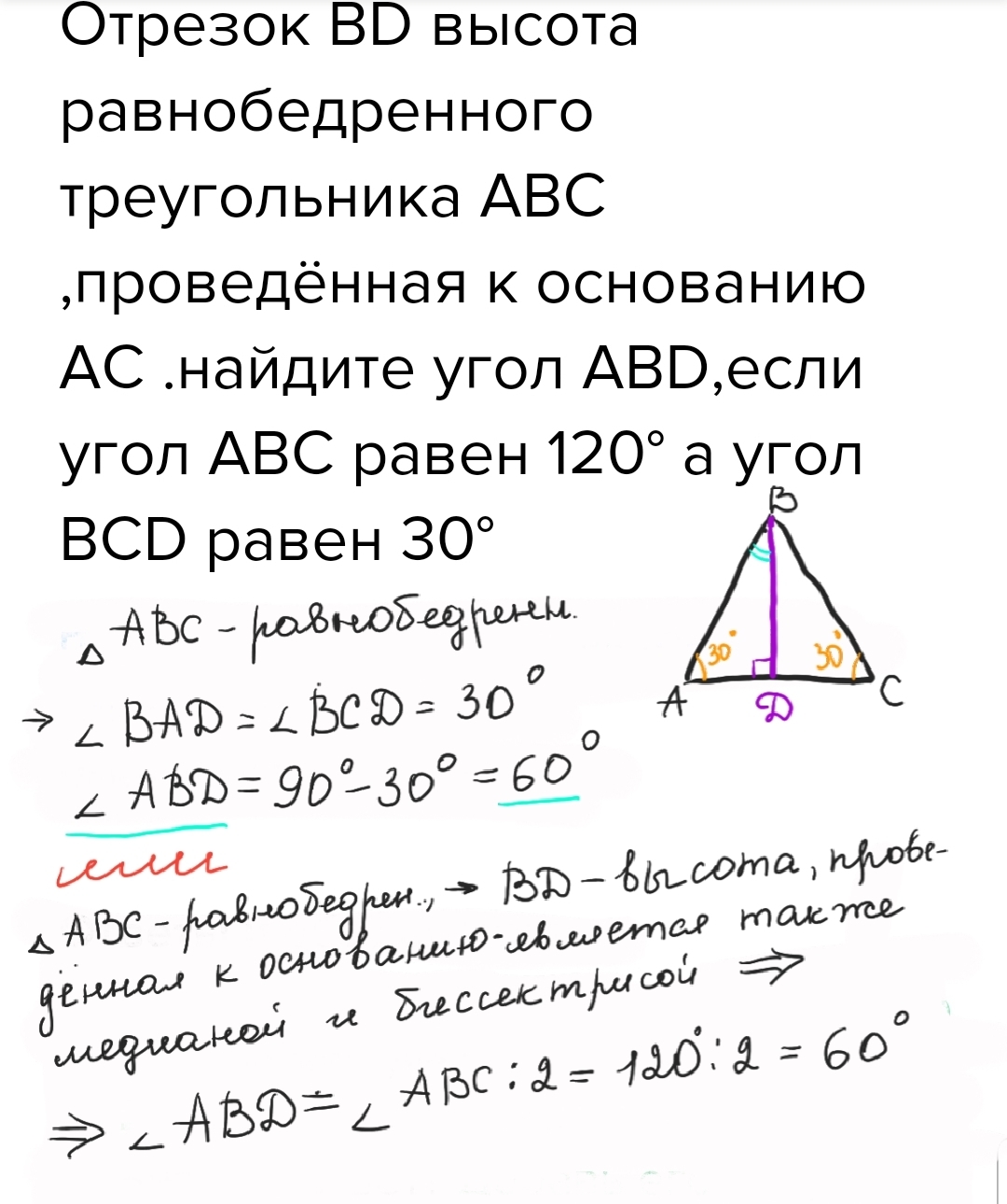Отрезок BD высота равнобедренного треугольника ABC ,проведённая к основанию AC .найдите угол ABD,если угол АBC равен 120° а угол BCD равен 30°