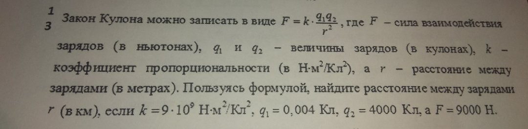 Закон Кулона можно записать в виде F=k⋅q1q2/r^2, где F – сила взаимодействия зарядов (в ньютонах), q1 и q2 – величины зарядов (в кулонах), k – коэффициент пропорциональности (в Н ⋅ м^2 /Кл^2 ), а r – расстояние между зарядами (в метрах). Пользуясь формулой, найдите расстояние между зарядами r (в км), если k=9⋅10^9 Н ⋅ м^2 /Кл^2, q1=0,004 Кл, q2=4000 Кл, а F=9000 Н.