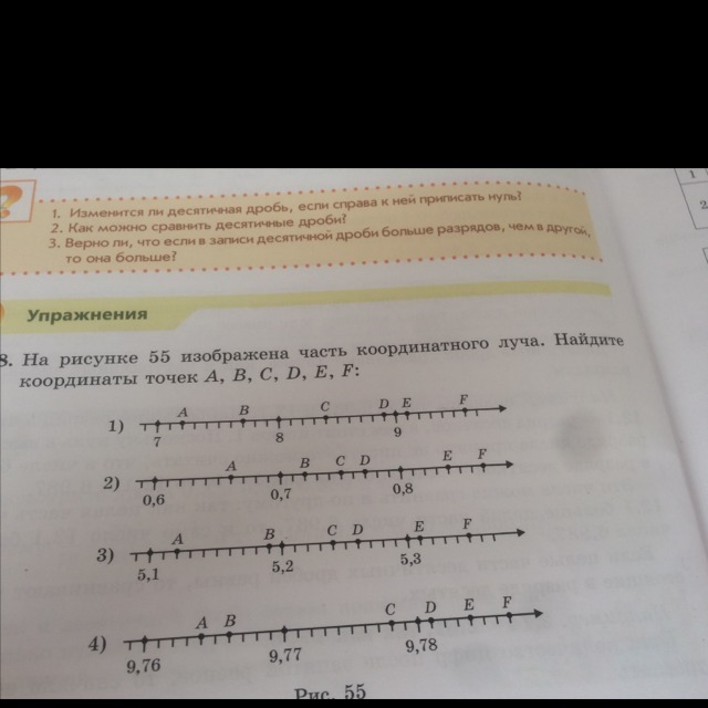 На рисунке 55 изображена часть координатного луча Найдите координаты точек А B C D E F