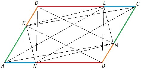 Четыре пары равных отрезков на параллельных сторонах исходного параллелограмма: AK=CM, AN=CL, BK=DM, BL=DN