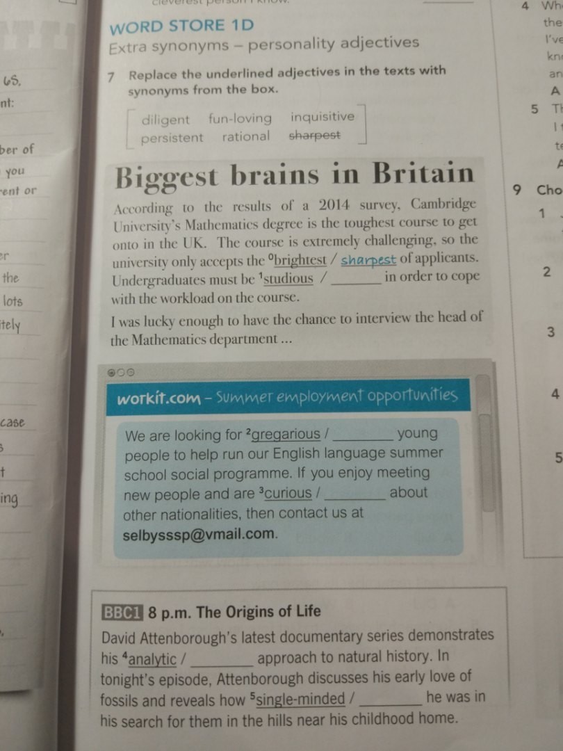 7 Replace the underlined adjectives in the texts with synonyms from the box.