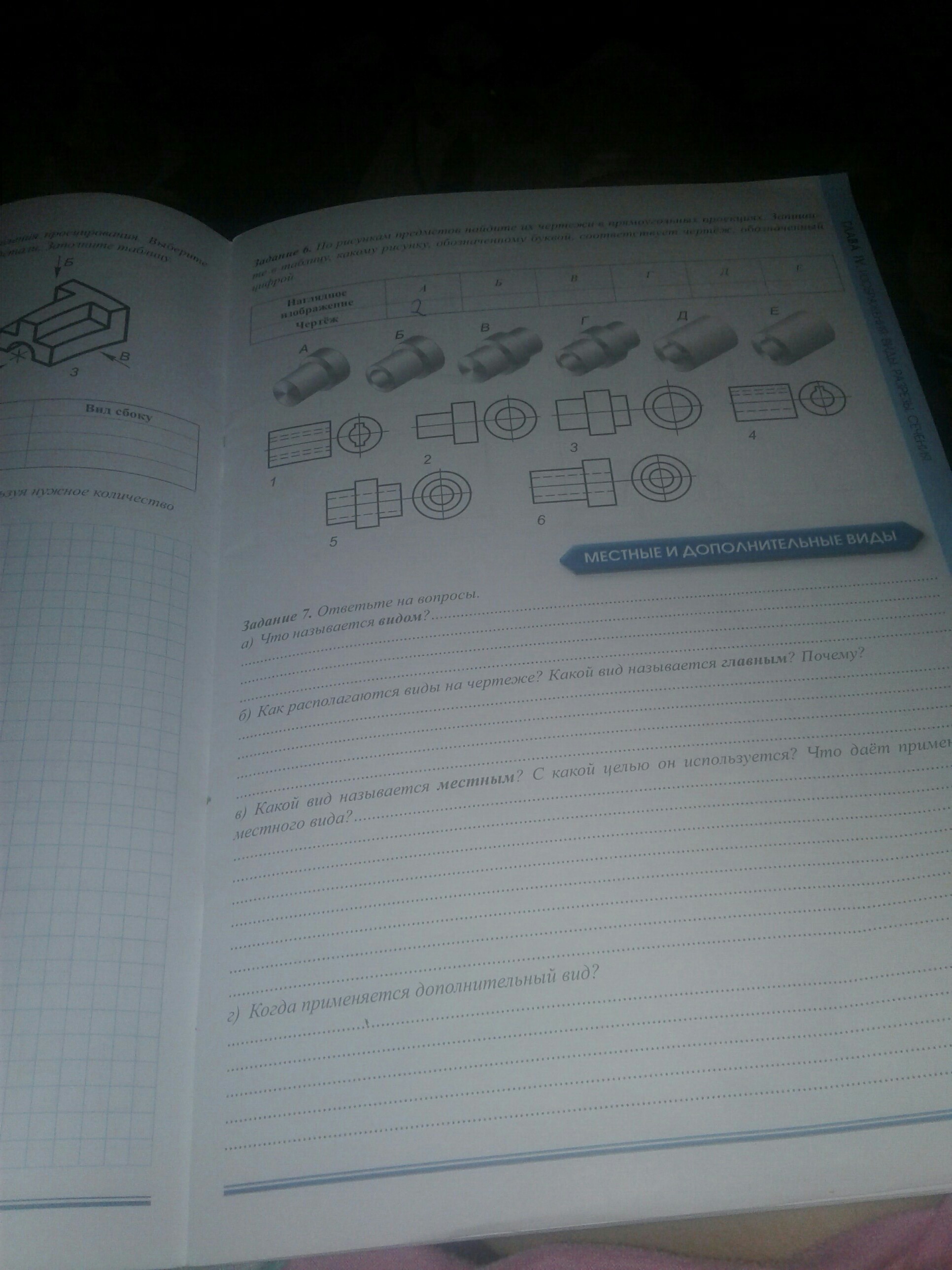 Изображение отдельного, ограниченного места поверхности предмета называется местным видом. Его применяют в том случае. когда требуется показать форму и размеры отдельных элементов детали (фланца, шпоночной канавки и пр.).