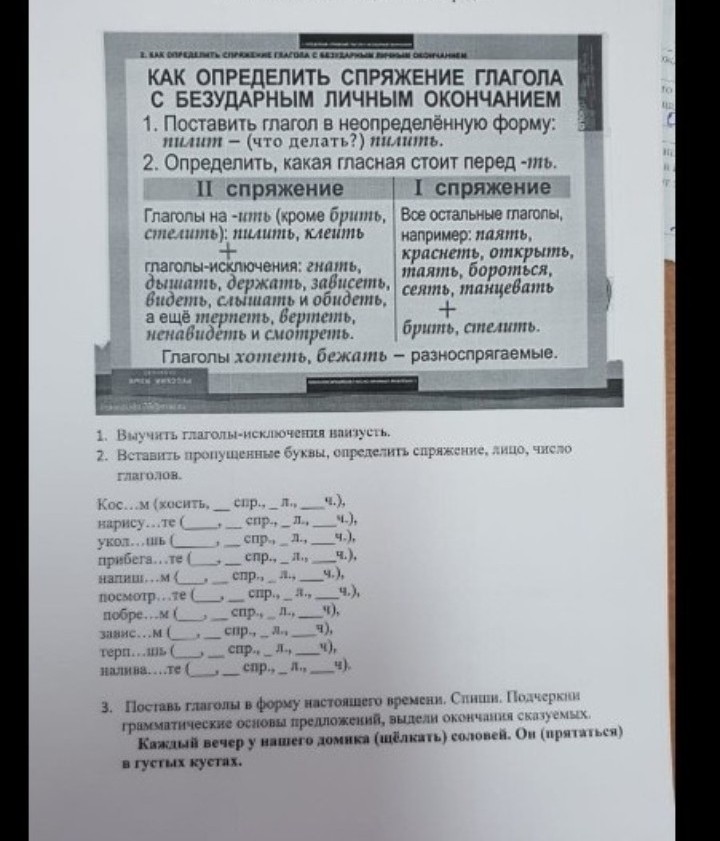 2. Косим(косить,2 спр,1 л.,мн.ч.) ; нарисуете(нарисовать,1 спр,2 л.,мн.ч.); уколешь(уколоть,1 спр, 2 л.,ед.ч.); прибегаете(прибегать,1 спр,2 л.,мн.ч.); напишем(написать,1 спр, 1 л.,мн.ч.);посмотрите(посмотреть,2 спр, 2 л., мн.ч.); побреем(побрить,1 спр,1 л.,мн.ч.); зависим(зависеть,2 спр, 1л,мн.ч.); терпишь(терпеть, 2 спр, 2 л.,ед.ч.); наливаете(наливать, 1 спр, 2 л.,мн.ч.).