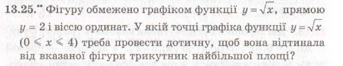 Фигура ограничена графиком функции (y=sqrt(x)),прямой (y=2) и осью ординат. В какой точке графика функции (y=sqrt(2)) (0 <= x <= 4 ) нужно провести касательную, чтобы она отсекала от указанной фигуры треугольник наибольшей площади?
