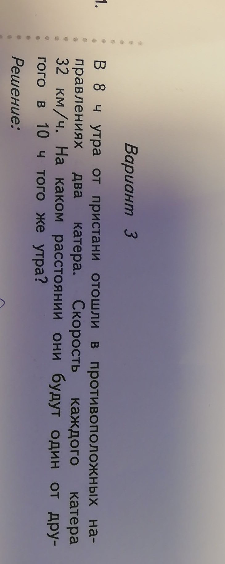 В 8 ч утра от пристани отошли с с противоположных направлениях два катера. Скорость каждого катера 32км/ч.На каком расстоянии они будут один от другого в 10ч того же утра?
