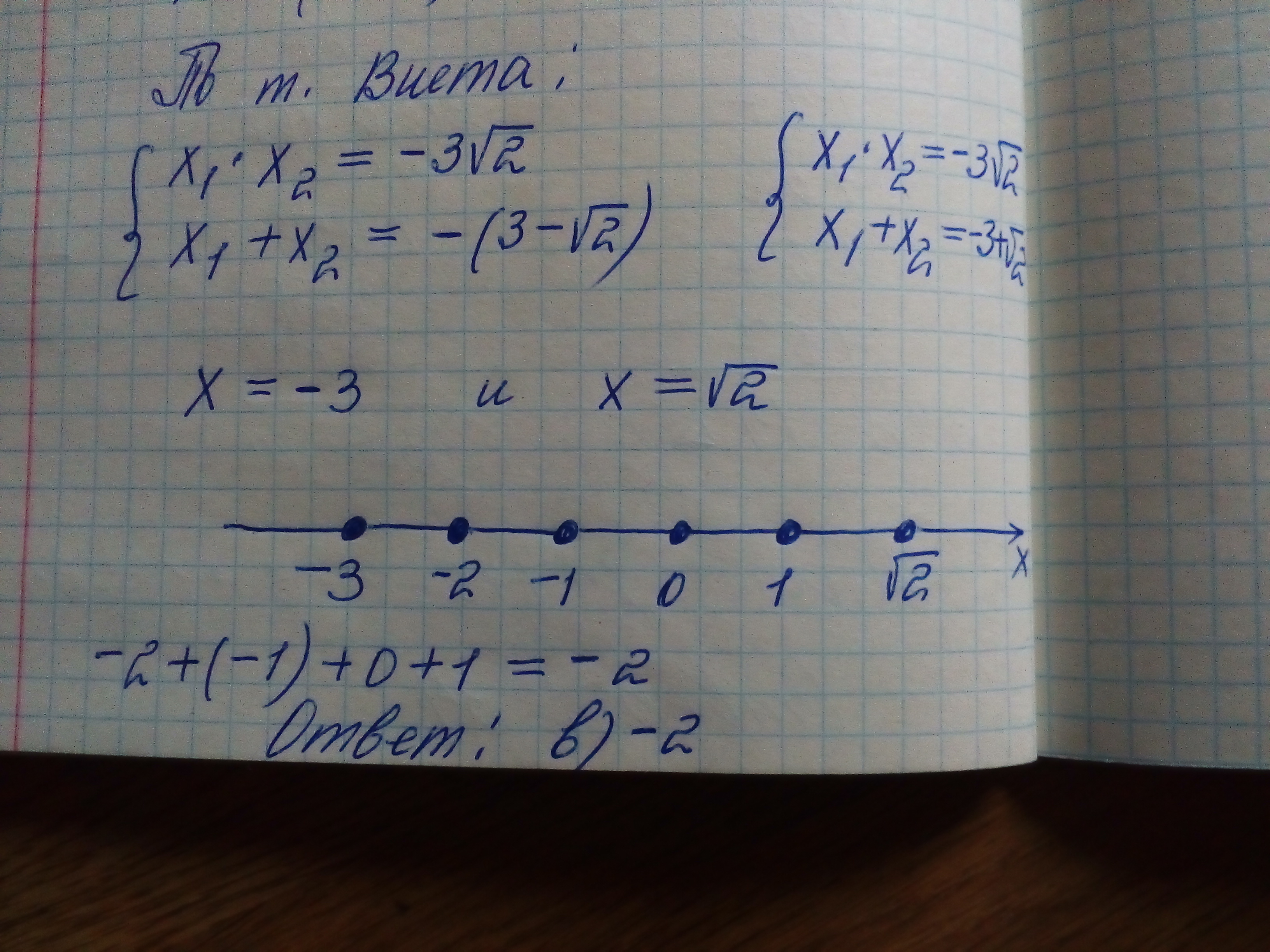 сумма целых чисел, заключенных междк корнями ураанения х²+(3-√2)х-3√2=0 равна: а)0