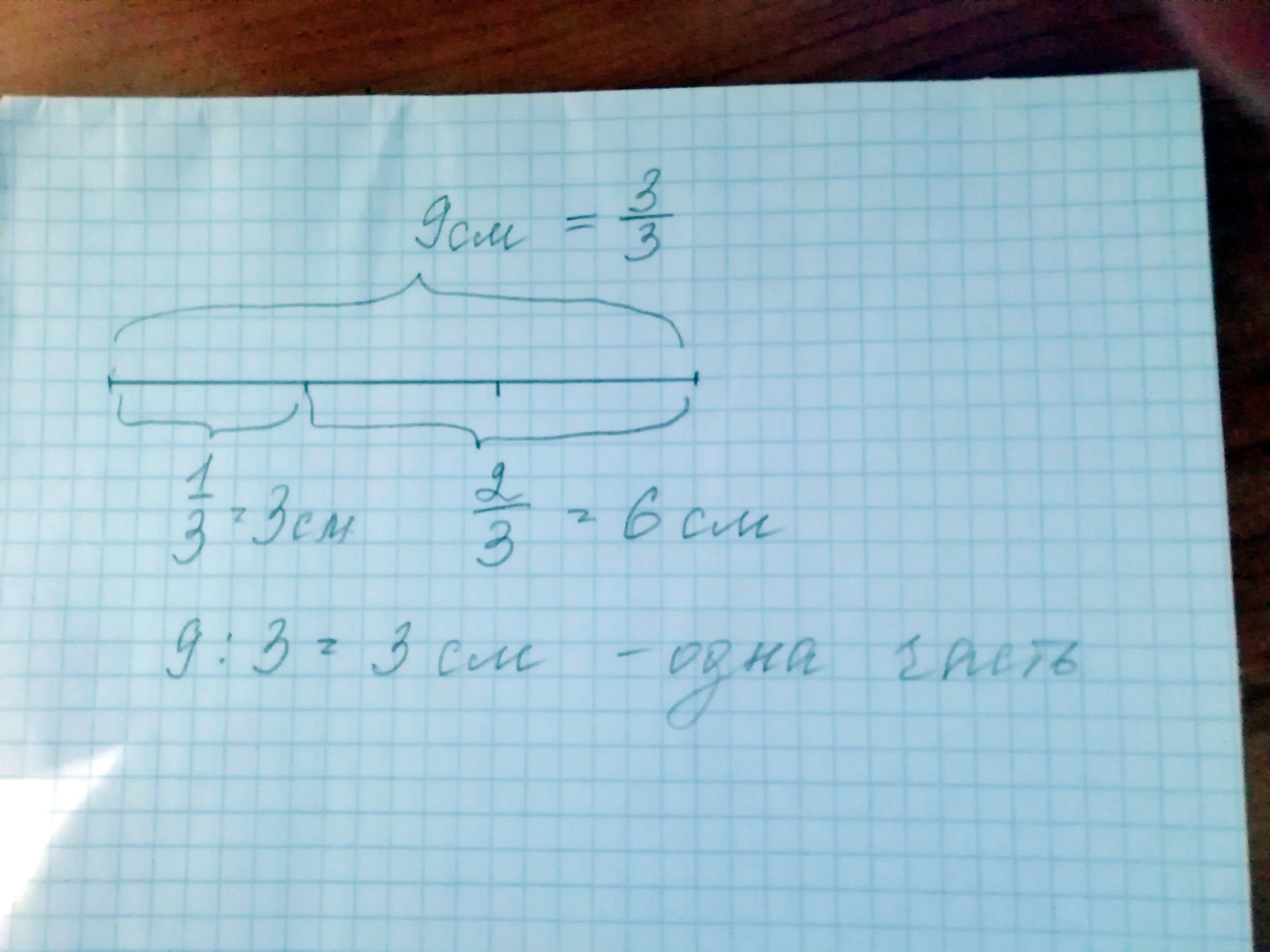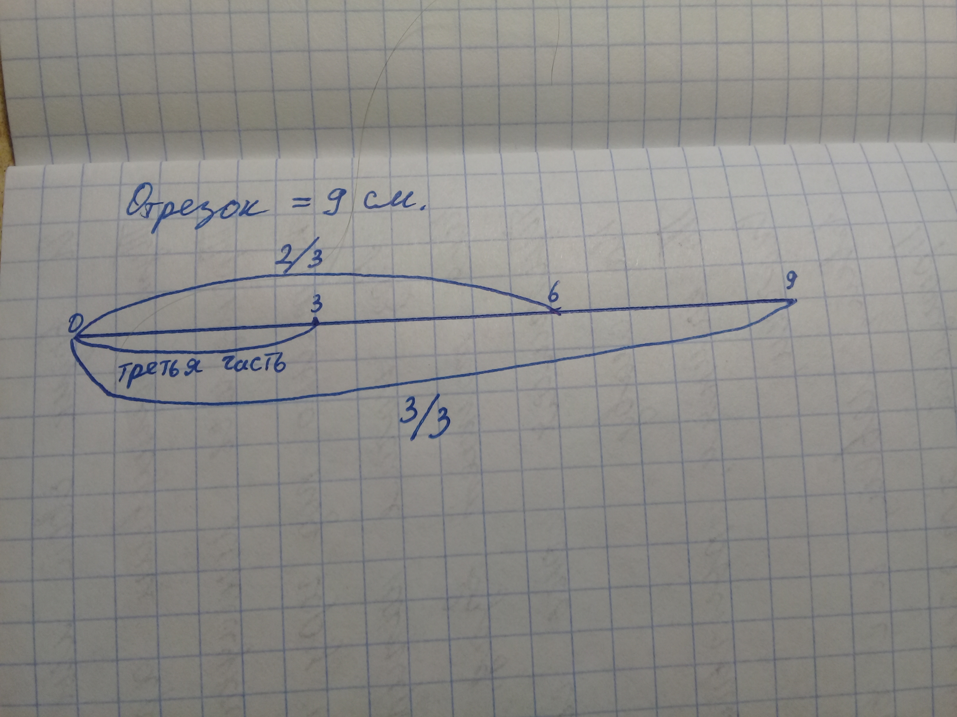 Начертить отрезок длиной 9 см.Показать третью часть отрезка и вычислить его длину.Какое действие вы выполнили? Покажите 2/3,3/3 доли отрезка.