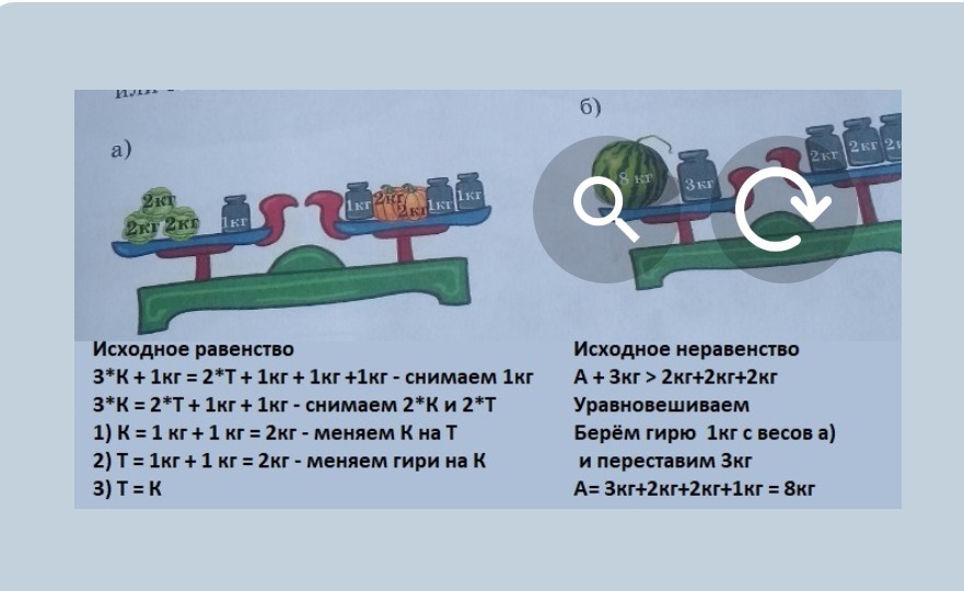 Составь равенства и неравенства по рисункам . Как можно уравнять чаши на весах на рисунке б., используя гири или овощи на рисунке а)