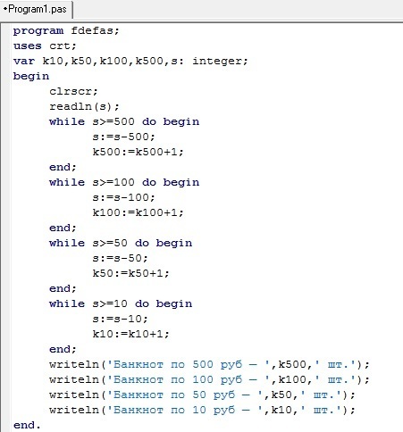 Запишите на языке Паскаль программу, реализующую алгоритм работы кассира, выдающего сдачу (s) наименьшим возможным количество м банкнот по 500 (k500), 100 (k100), 50 (k50) и 10 (k10) рублей.