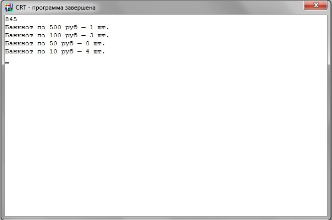 Мне кажется у вас опечатка, т.к при входных данных 845, количество банкнот по 10 рублей должно быть 4 штуки, а не 3.