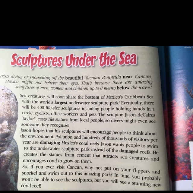 unsm скульптуры под морем туристы дайвинг или подводное плавание с маской и трубкой от красивого полуострова Юкатан недалеко от Канкуна Мексика может не поверить своим глазам. Это потому, что здесь есть удивительные скульптуры мужчин, женщин и детей на глубине до 8 метров под волнами! Морские существа скоро разделят дно Карибского моря Мексики с крупнейшим в мире подводным парком скульптур! В конце концов, будет 400 скульптур в натуральную величину, включая людей, держащихся за руки в кругу, велосипедистов, офисных работников и домашних животных. Скульптор, Джейсон декейрс Тейлор*, отливает свои статуи от местных жителей, поэтому дайверы могут даже увидеть кого-то, кого они узнают! Джейсон надеется, что его скульптуры заставят людей задуматься об окружающей среде. Загрязнение окружающей среды и сотни тысяч посетителей в год наносят ущерб коралловым рифам Мексики. Джейсон хочет, чтобы люди плавали в подводный парк скульптур вместо поврежденных рифов. Он создает статуи из цемента, которые привлекают морских существ и побуждают кораллы расти на них. Так, если вы когда-нибудь посетить Канкун, почему бы не надеть ласты и трубка и плавать в этот удивительный парк? Со временем вы, вероятно, не сможете увидеть скульптуры, но вы увидите потрясающий новый коралловый риф!