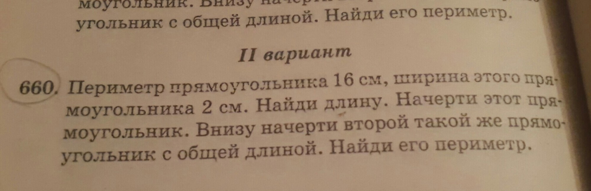периметр прямоугольника 16 см ширина этого прямоугольника 2 см Найди длину Начерти этот прямоугольник внизу Начерти 2 такой же прямоугольник с общей длиной Найдите его периметр