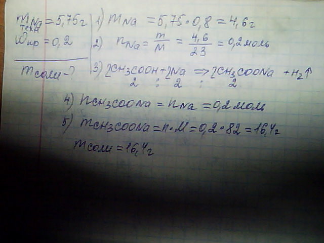 Найти массу соли, которая образуется при взаимодействии уксусной кислоты с натрием массой 5,75г, если он содержит 20% примесей.