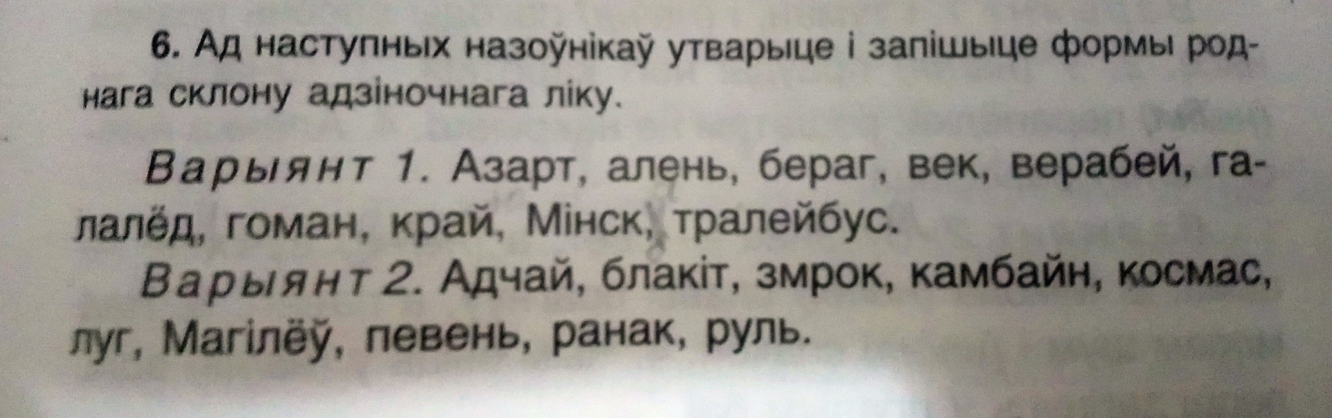 Адчаю, блакіту, змроку, камбайна, космасу, лугу, Магілёва, пеўня, ранку, руля.