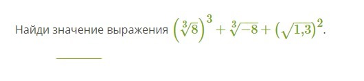 Куб. Корень из числа в кубе равен этому числу, получается противодействие. Куб корень из 8 в кубе равен 8. Куб корень из (-8) равен -2, т.к. (-2)*(-2)*(-2) = (-8) т.к степень нечетная. А квадрат корня из числа равен этому числу. ( если конечно все по одз ) корень из 1,3 в квадрате даёт 1,3. Итог : 8+ (-2) + 1,3 = 8-2+1,3= 7,3