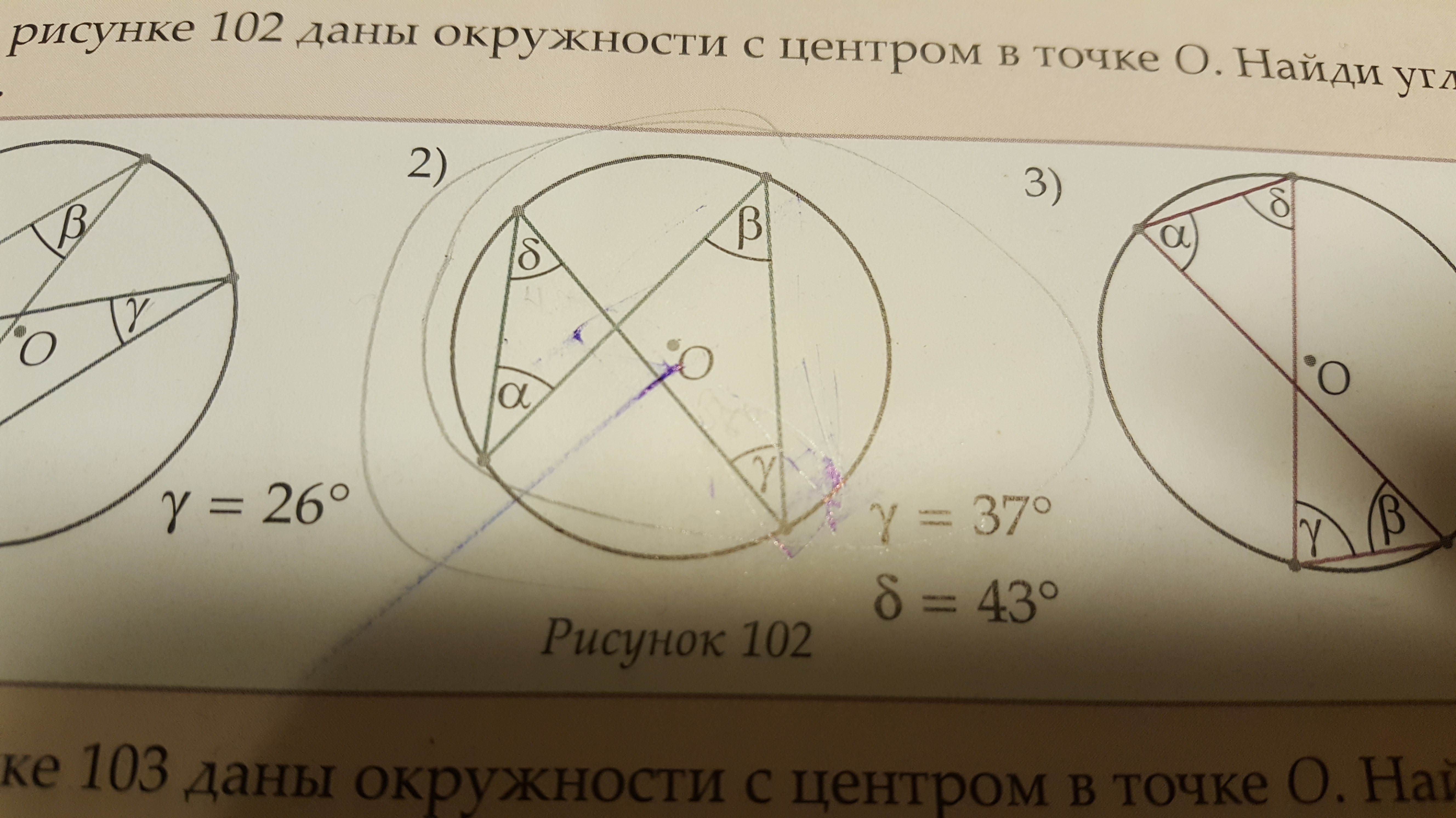 На рисунке 102 даны окружности с центром в точке О. Найди углы a( альфа) и В( бетта)