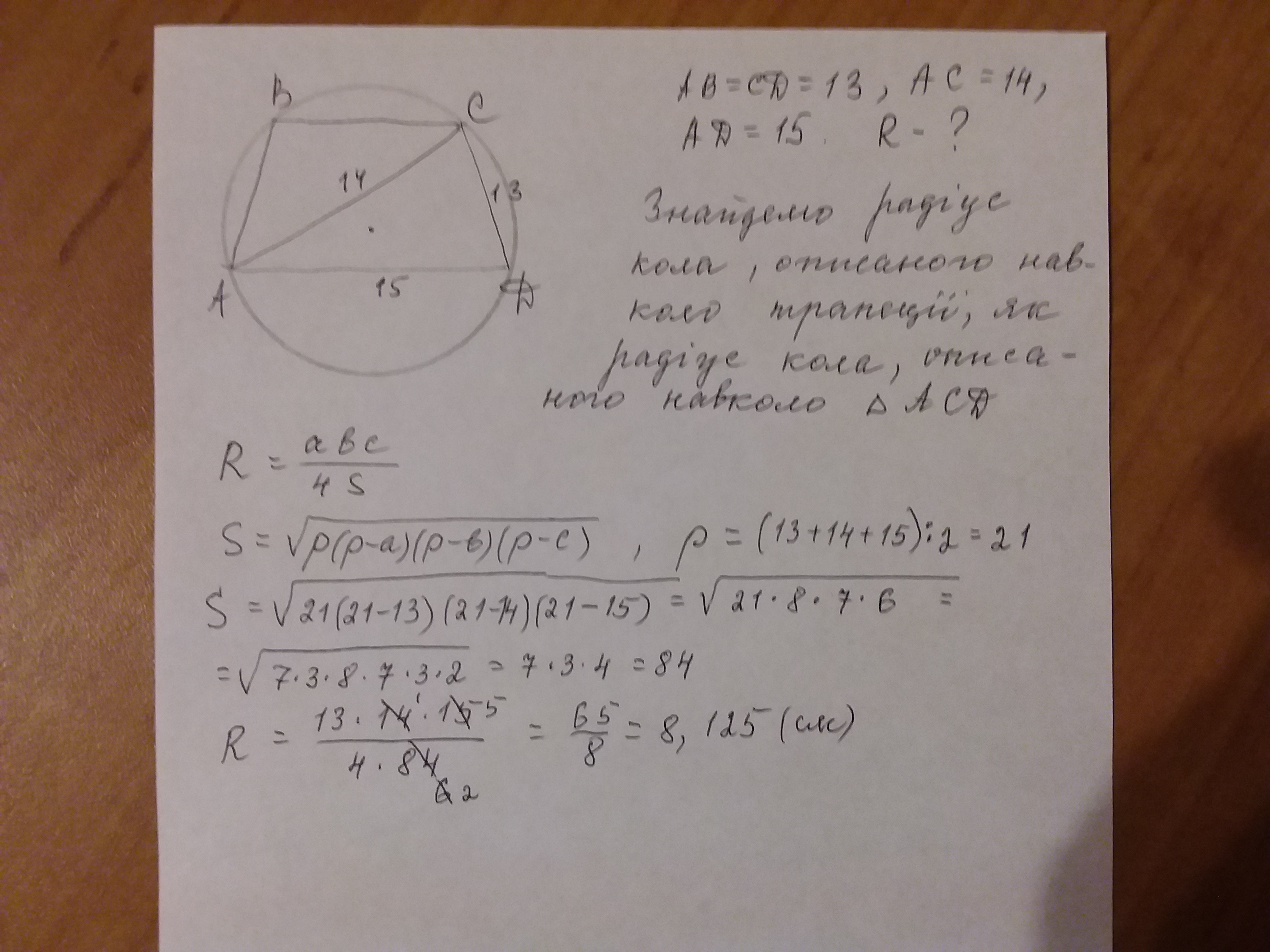 Обчисліть радіус кола, описаного наколо рівнобічної трапеції, бічна сторона якої дорівнює 13 см, діагональ-14см, більша основа- 15 см