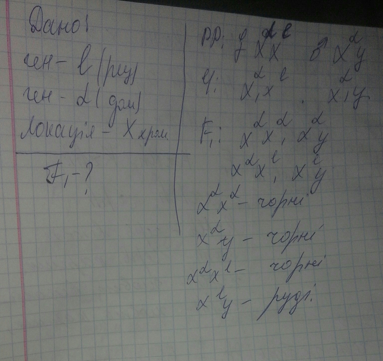 Пожалуйста Ген , який визначає забарвлення шерсті у котів розташований у х-хромосомі . Один із його алелів визначає чорне забарвлення , а другий - руде . У випадку , якщо організм є гетерозиготою за цим геном , то його забарвлення черепаховим . Який колір шерсті матимуть нащадки від схрещування чорного кота й черепахової кішки ?