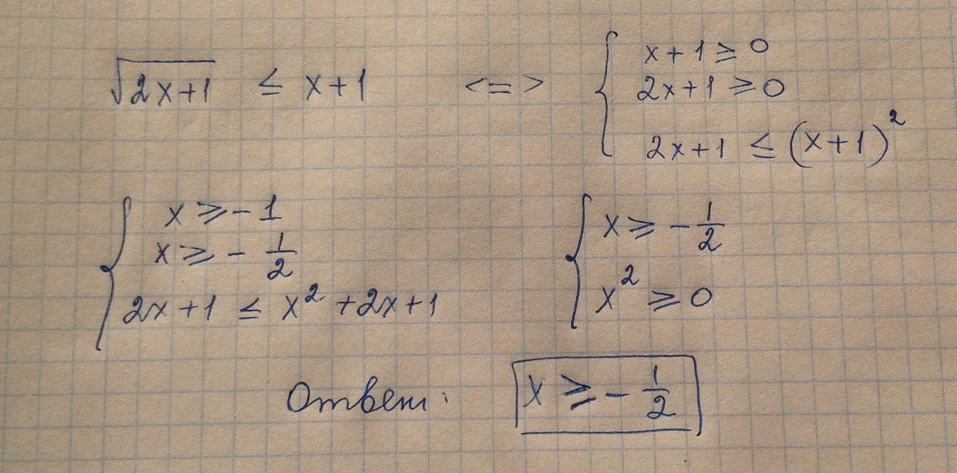 Корень из 2x+1 меньше или равно x+1