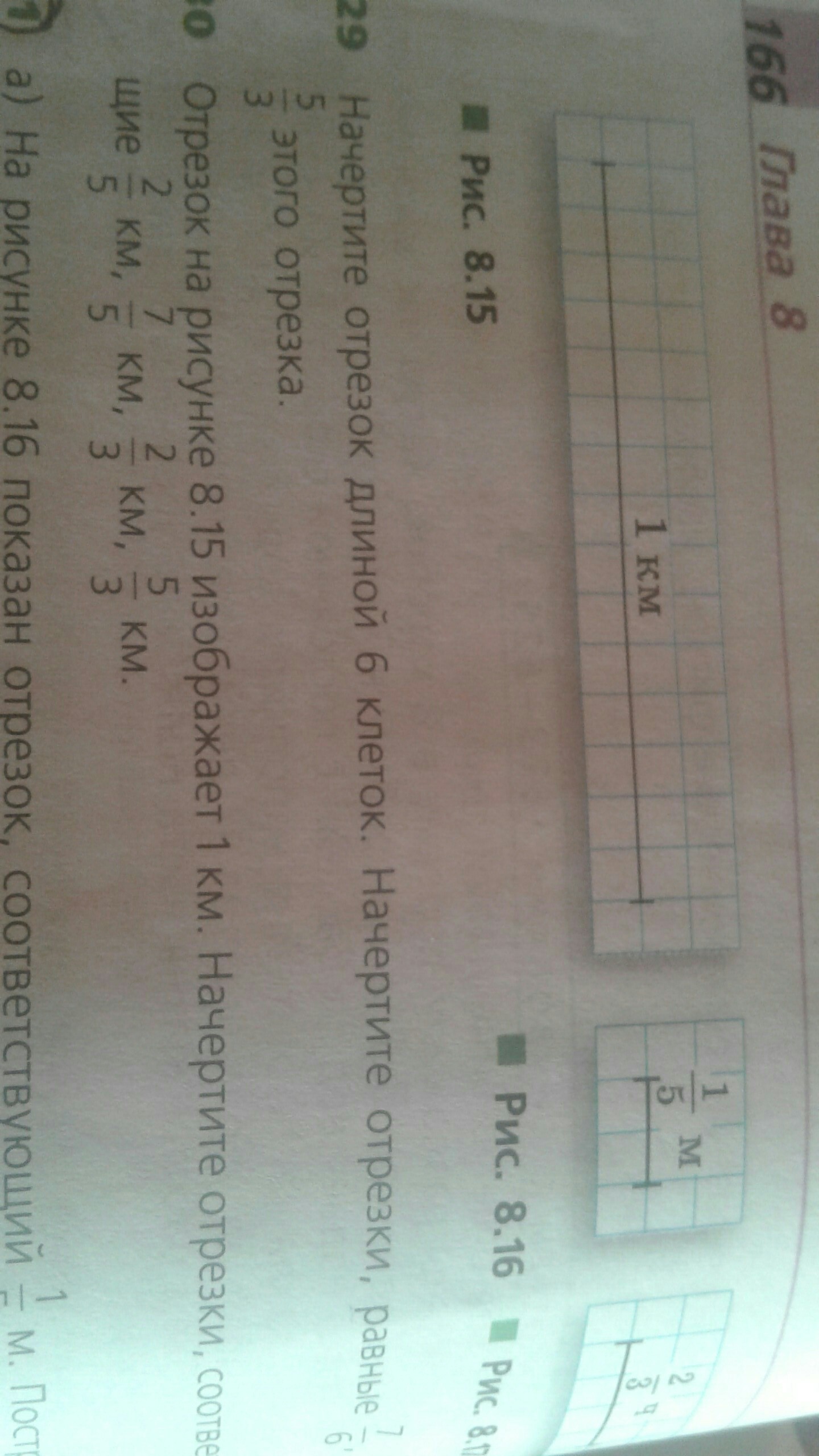 отрезок на рисунке 8.15 изображает 1 км. начертите отрезки соответствующие 2/5 км, 7/5 км, 2/3км,5/3км.