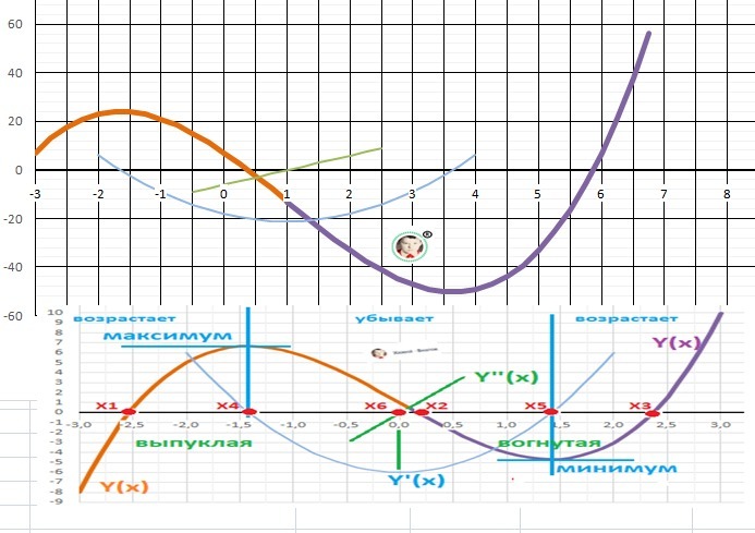 Корни Y'(x)=0. Х4=-1,65 Х5=3,65
