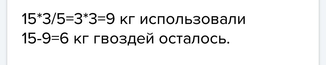1.Для ремонта школы купили 15 кг гвоздей, но всего использовали 3/5 всех гвоздей. Сколько гвоздей израсходовали?
