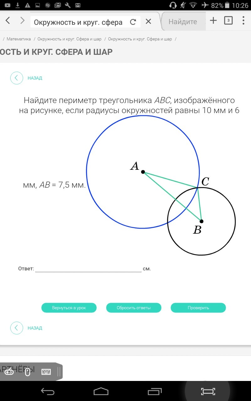 Найдите периметр треугольника ABC, изображённого на рисунке, если радиусы окружностей равны 10 мм и 6 мм, AB = 7,5 мм.